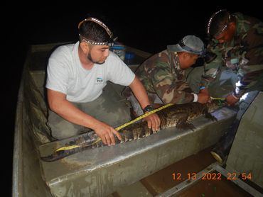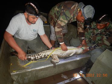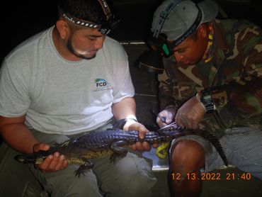 In December 2022, we revisited Chiquibul National Park to lead two nights of capture surveys, in which we captured seven crocodiles on the Raspaculo River on December 13, 2022, and twelve crocodiles on the Macal River on December 14, 2022. Altogether, we captured and assessed 19 Morelet's crocodiles. Of the 19 crocodiles caught, we classified one as hatchling (5%), seven as juveniles (37%), four as subadults (21%) and six as adults (37%). All individuals appeared in excellent physical condition with little to no wounds. The overall population sex ratio was not significantly different from 1:1 as we captured ten males and nine females, However, Raspaculo River exhibited a strong female bias (1:2.5), which has only been observed in this area over the years. In both surveys, we did not encounter evidence of pollution. Nonetheless, FCD researchers suggest the Chalillo dam has caused a high concentration of mercury (Hg) in the river system. Although the crocodile population in the Chiquibul Forest seems stable and relatively free from threats, research and monitoring are warranted, especially since it represents one of the few remaining genetically pure populations of Morelet’s crocodile in Belize.